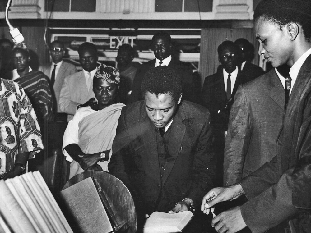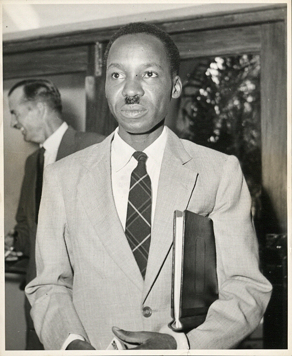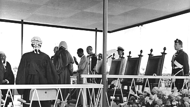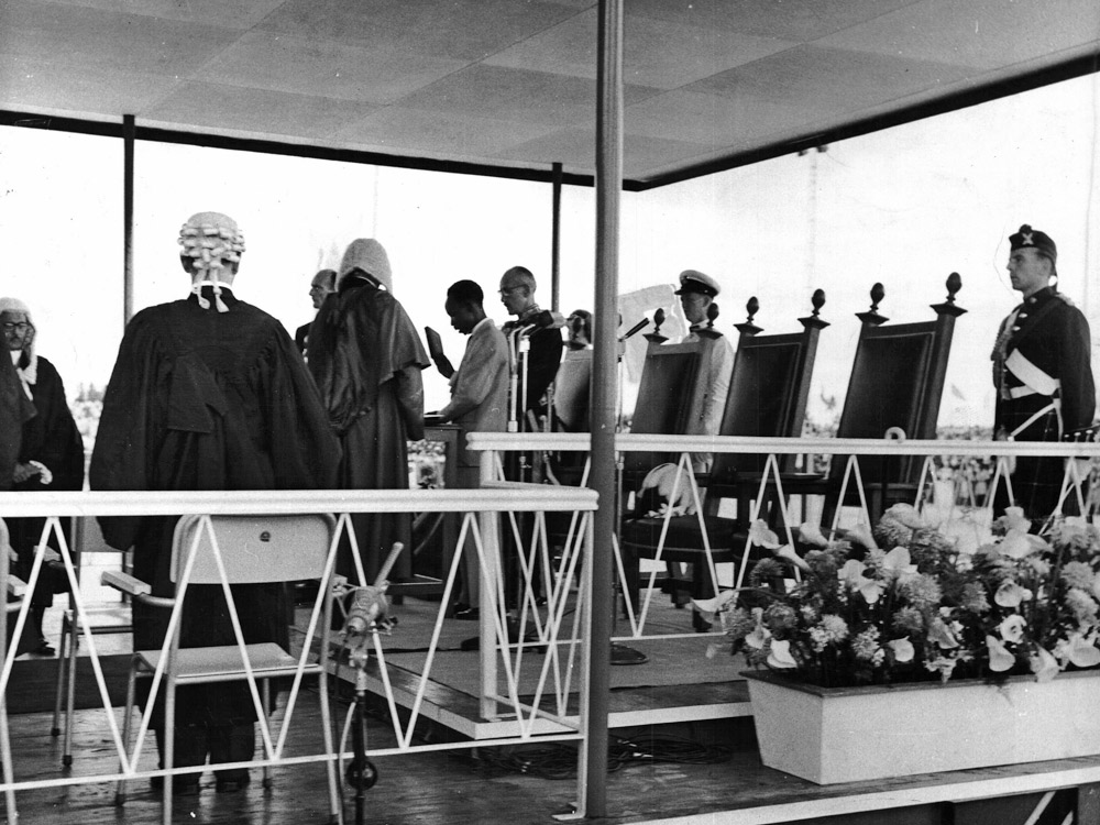 Description: DEV.49/7. Swearing-in of Tanganyika's new Ministers at Government House, Dar es Salaam. This picture shows Mr. J.k. Nyerere taking the oath as Tanganyika's first Chief Minister.