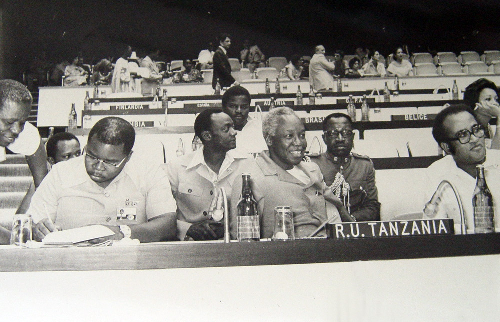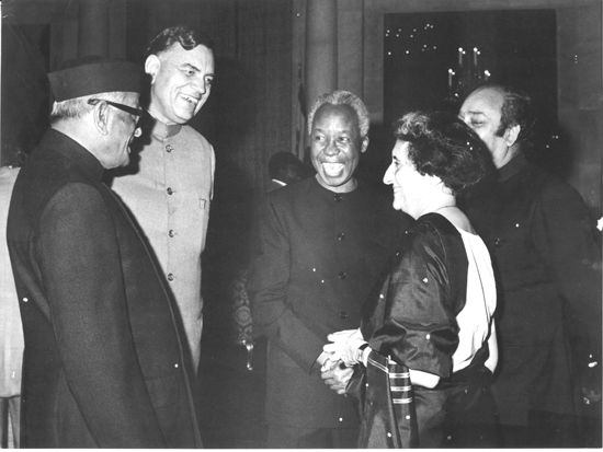 Long Live the Friendship - Julius Nyerere with Indira Gandhi, at a dinner hosted by her, New Delhi, 22 February 1982; also seen are Salim Ahmed Salim, and P.V. Narsimha Rao, then External Affairs Minister of India (later Prime Minister)